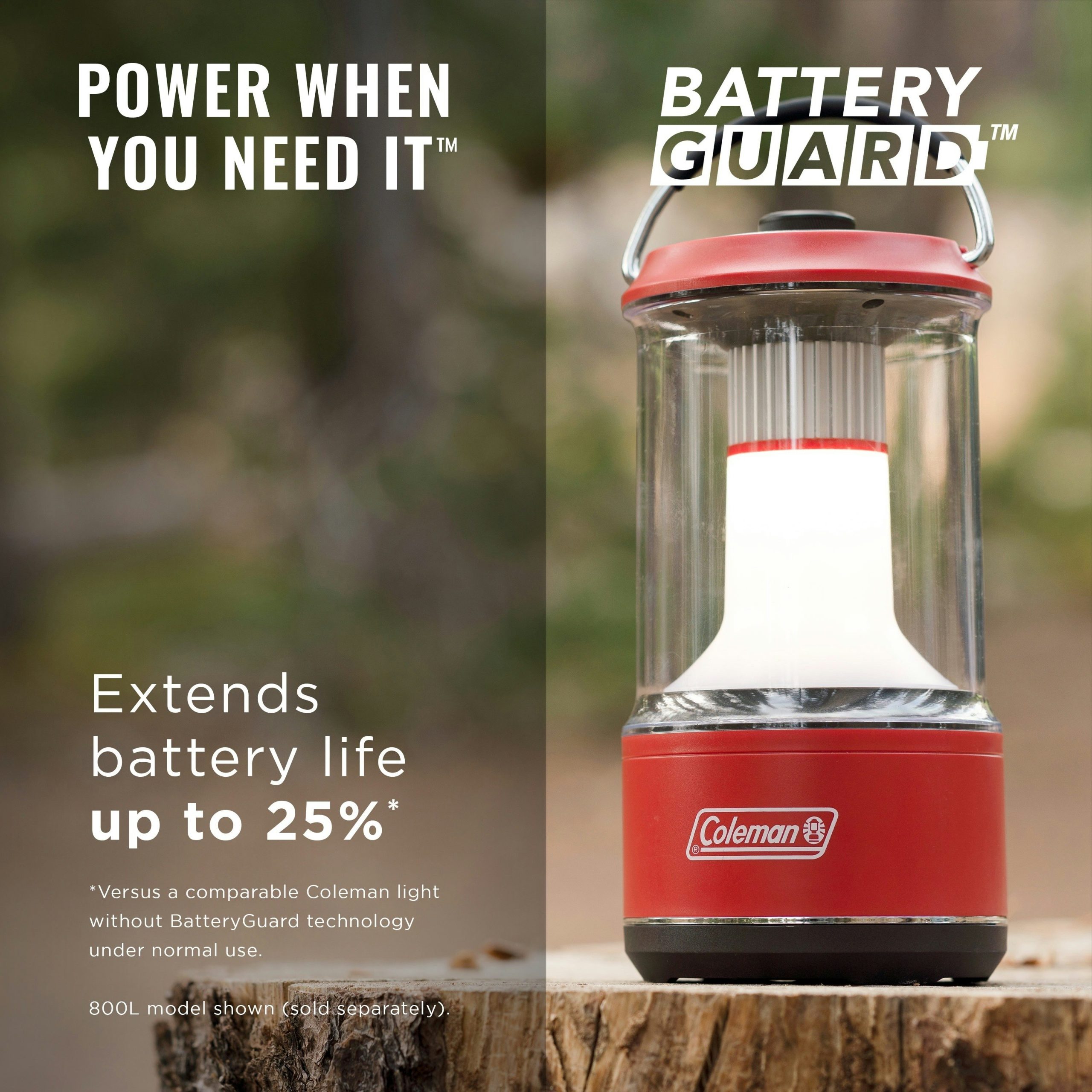The 1000 Lumens LED Lantern with BatteryGuardâ„¢ stops battery drain so you have power when you need it most. Conventional lanterns experience residual power drain as long as batteries are connected to the circuit. With BatteryGuard, batteries are automatically disengaged from the circuit when the lantern is turned off to extend their life by as much as 25%. It also reduces the chance of damaging corrosion so batteries can be stored in the device for years (up to their inherent shelf life). Additional features include a rotating dial to switch between high, medium, low, and flashing modes, up to 14 hours runtime on high using 4 D batteries (sold separately), water resistance, impact resistance up to 2 meters (on dirt), and lifetime LED bulbs that never need replacing. No matter the situation, this BatteryGuard lantern with a 16-meter beam gives you Power When You Need Itâ„¢.