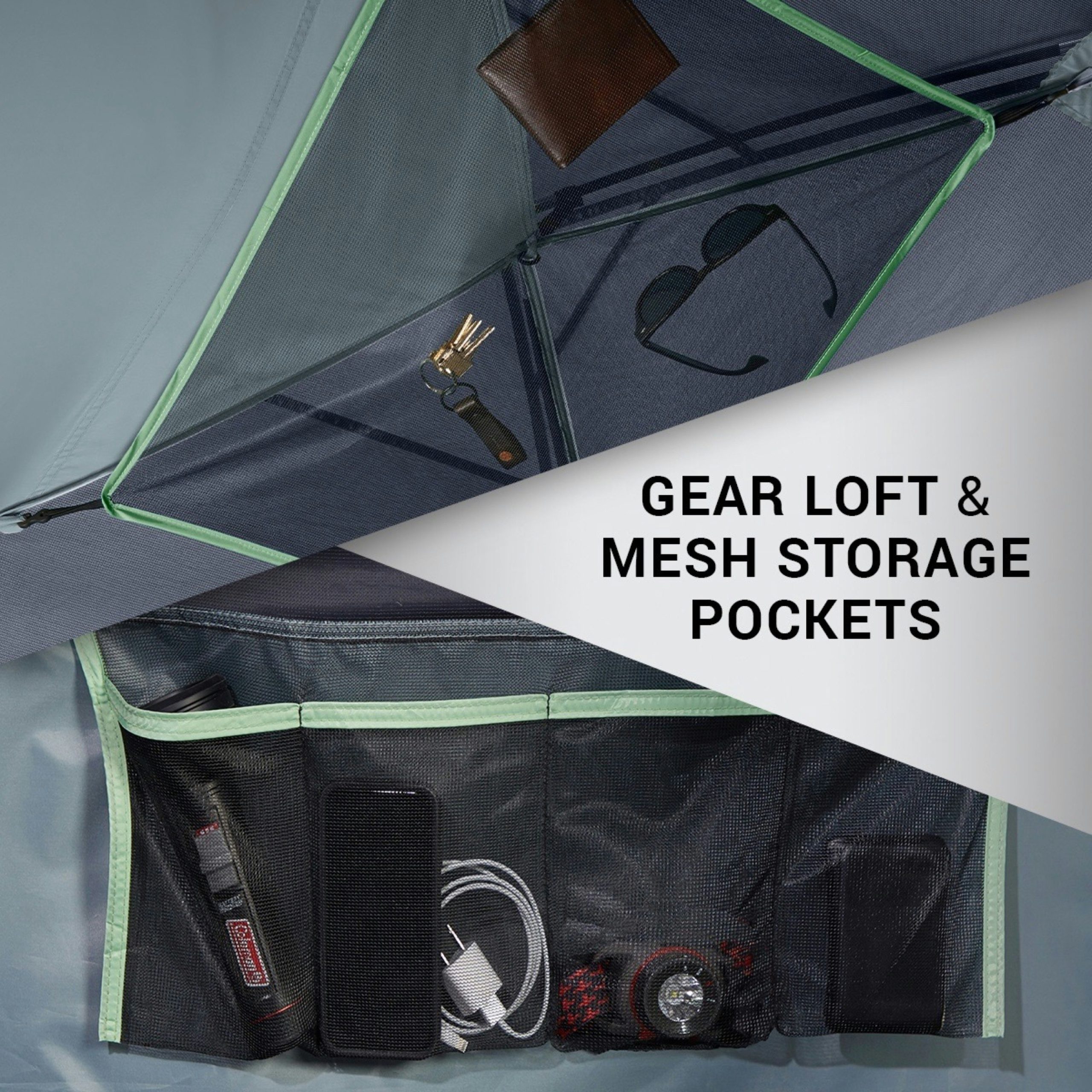 - Mesh storage pockets and a gear loft keep small items organized