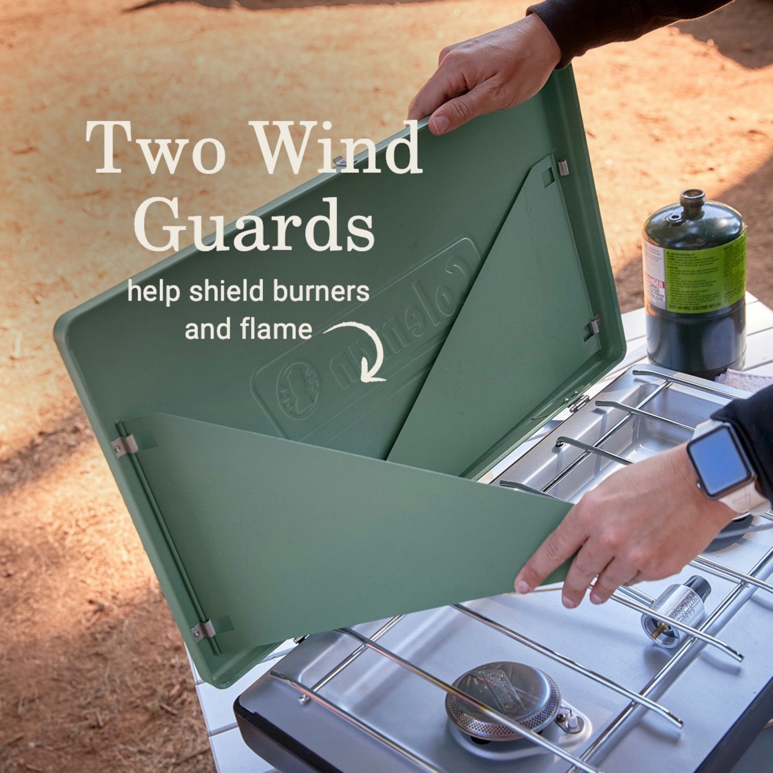 - TWO WIND GUARDS: Help shield burner and flame from wind