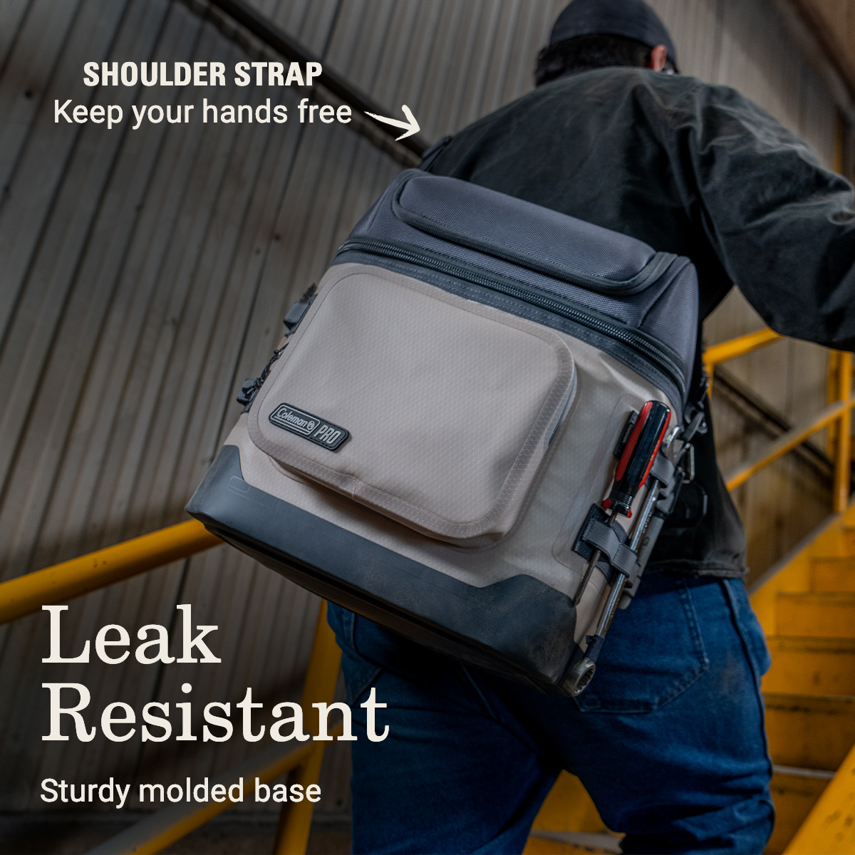 Coleman Pro is gear that works hard like you. It is purpose-built for everyday use in the most demanding environments. The Coleman Pro 24-Can Soft Cooler will keep your lunch and drinks for the crew cold all day. A separate dry storage compartment is a handy spot to store keys, phones, and more. Built tough, the durable exterior is puncture resistant and backed by a 3-year limited warranty. The antimicrobial treatment to the interior helps protect it from odor causing bacteria while a compression molded base protects the soft cooler to help prevent leaks. Throw the Coleman soft cooler over your shoulder to keep your hands free to carry toolboxes or fishing gear. Work smarter, not harder with oversized zipper pulls for easy access in work gloves and reflective molle webbing for extra storage.***Antimicrobial properties are built in to protect the product from odor causing bacteria. The product does not protect users or others from disease causing bacteria. Always clean this product thoroughly after each use.