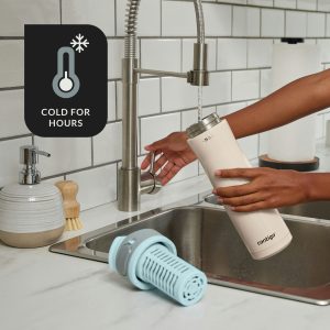 Have better-tasting water anytime and anywhere with the Clybourn Chill Stainless Steel FreeFlow Filter Water Bottle with AUTOSEAL Lid®. With the only free-flow filter on the market and carbon filter fiber technology that reduces chlorine taste and odor,* this bottle is perfect for anyone looking to improve the quality of their water in just seconds. Spill-proof AUTOSEAL technology means no spills in your car, on your desk, or wherever you are, and the stainless steel body means your drinks stay cold all day. Even carrying it around is easy thanks to an integrated handle and convenient design that allows for one-handed drinking. When you’re done drinking, click the lid back into place to help protect the bottle from dirt and grime, then lock the lid for extra protection. Bonus? It’s an even better choice if you’re looking for an alternative to single-use plastic—filters last 4-6 months and replace 600 (16.9 fl. oz.) single-use water bottles​.*Meets NSF 42 standard for reduction of Chlorine (taste & odor) and particulates (Class VI)​