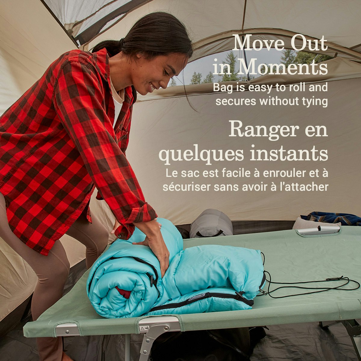 - Quick Cordâ„¢ secures the rolled-up bag without tying