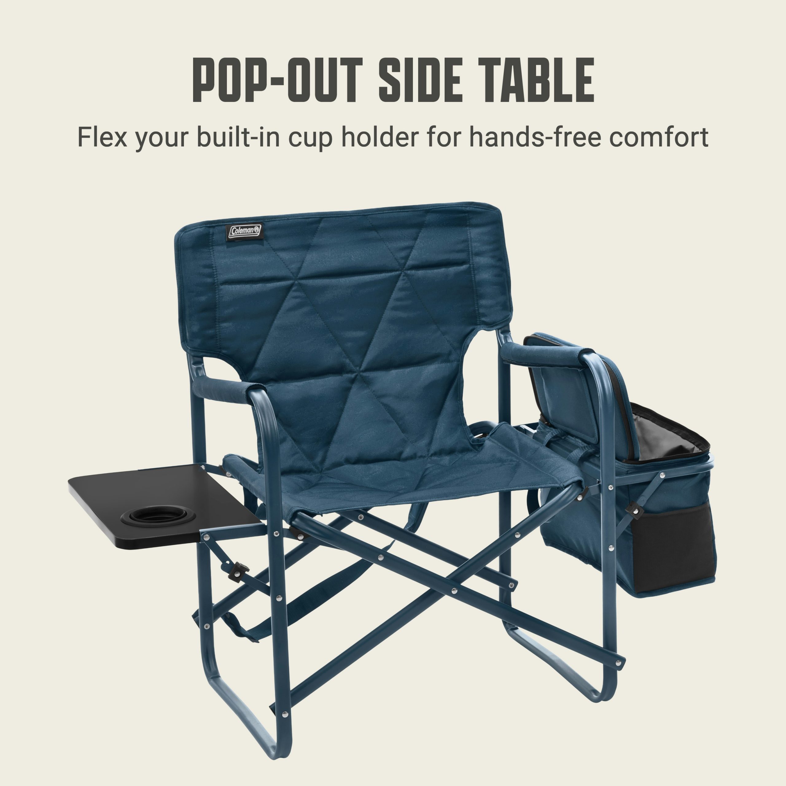 - POP-OUT TABLE & COOLER: A handy built-in side table and 28-can detachable Coleman® soft-sided cooler with a hard-top lid​