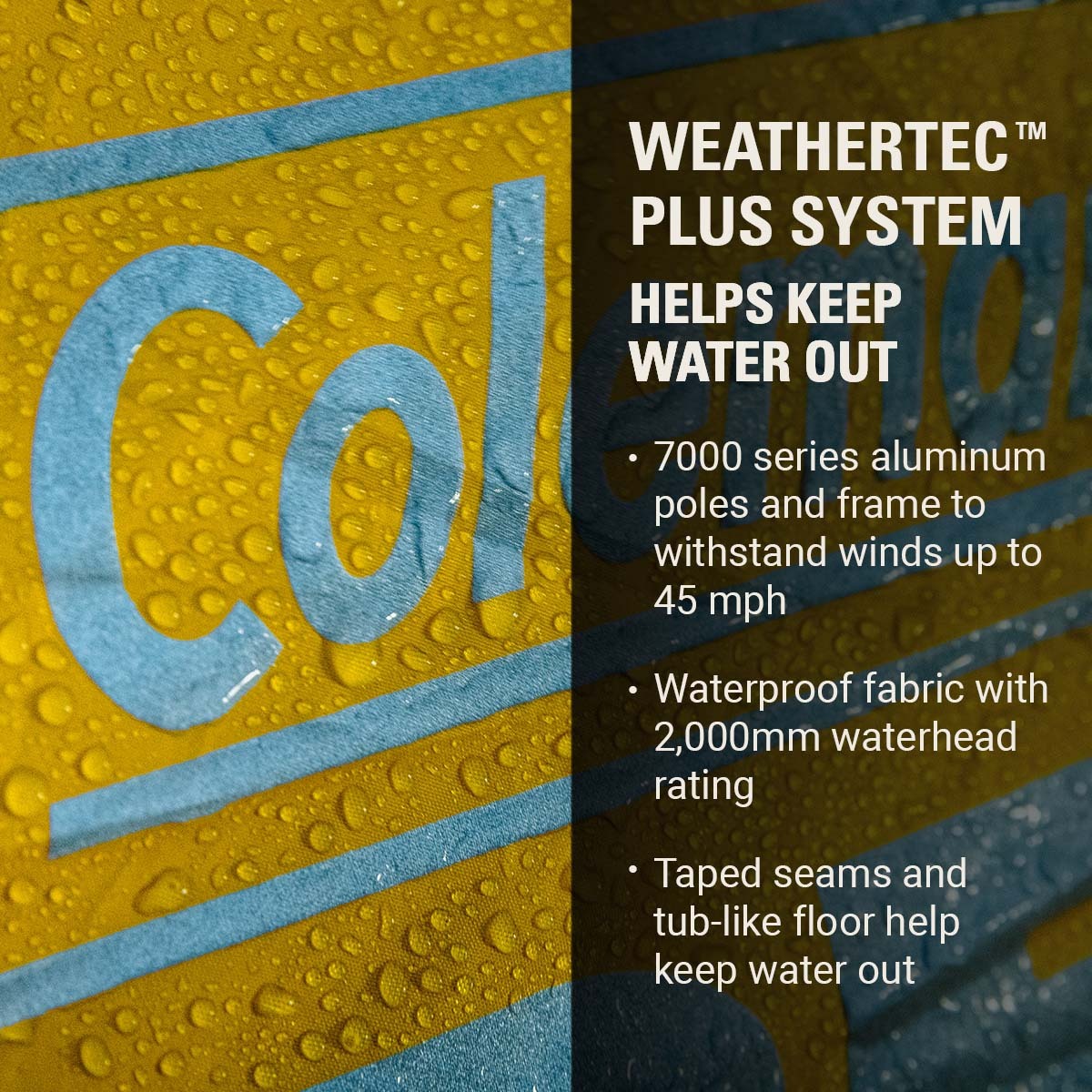 - BLOCKS WIND AND RAIN: WeatherTecâ„¢ Plus system has 7000 series aluminum poles and frame to withstand winds up to 45 mph; waterproof fabric with 2,000mm waterhead rating, taped seams to help keep water out, and a tub-like floor