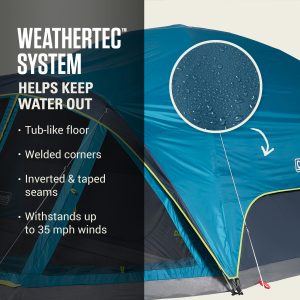 - MORE HEADROOM & WIDE DOOR: Nearly vertical walls provide 20% more headroom than traditional Coleman® tents; wide door makes it easier to move airbeds, sleeping bags, and other gear in and out of the tent
