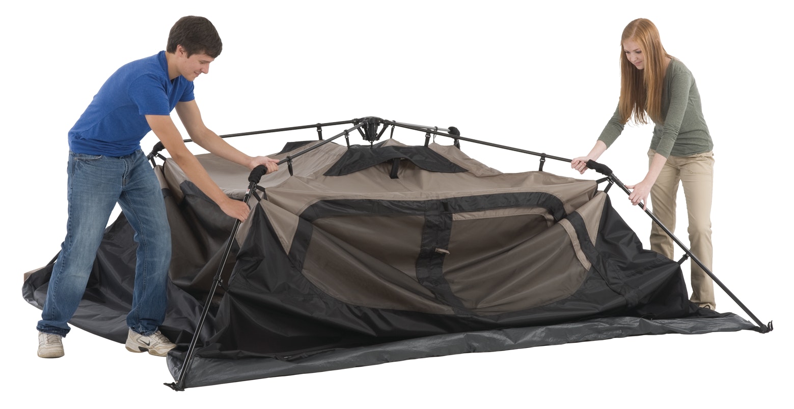 Getting camp set up is easier and faster than ever with the 6-Person Cabin Camping Tent with Instant Setup. Unfold, extend, and secure your tent in 60 seconds to start enjoying the great outdoors. An integrated vented rainfly offers added protection from the rain and improves airflow without the need for extra assembly.
