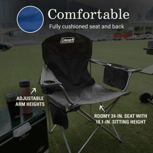 Always have a cold drink within easy reach at the campsite, tailgate, or kids’ ball game thanks to the cooler built into the armrest of the Camping Chair with Built-In 4-Can Cooler. The fully cushioned seat and back mean you’ll enjoy hours of relaxing comfort.