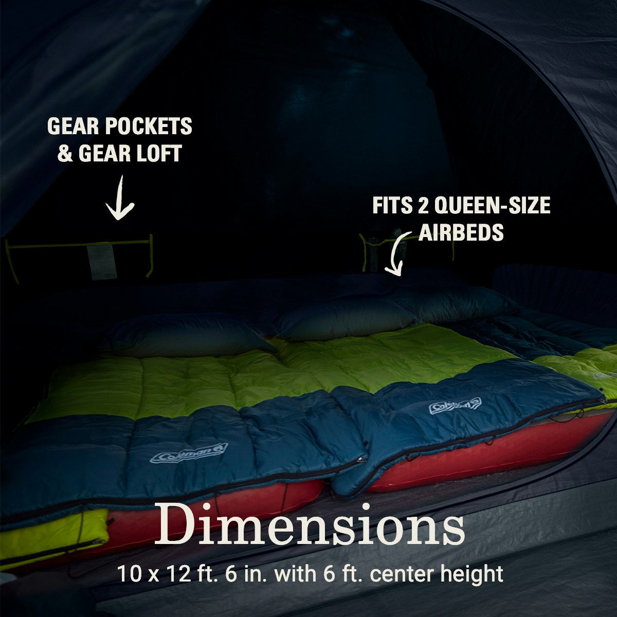 - DIMENSIONS: 10 x 12 ft. 6 in. with 6 ft. center height; fits 2 queen-size airbeds