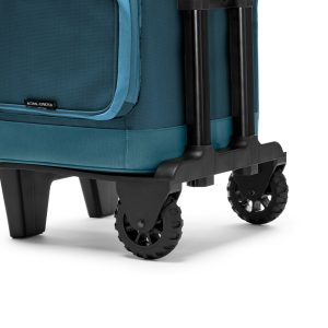- Heavy-duty wheels, telescoping locking handle for easy pulling across rough terrain